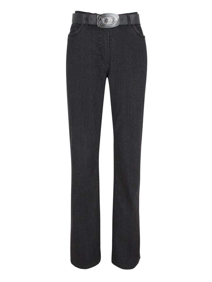 sportive Damen Jeans in hochwertiger Qualität, hoher Tragekomfort mit einer besonders figurfreundlichen Passform, hoher Bund, leicht ausgestelltes Bein, klassische 5-Pocket-Form, Gesäßtaschen mit farblich abgesetzter Stickerei, inklusive Gürtel mit modischer Metall-Gürtelschnalle